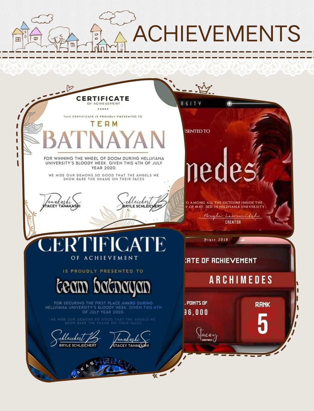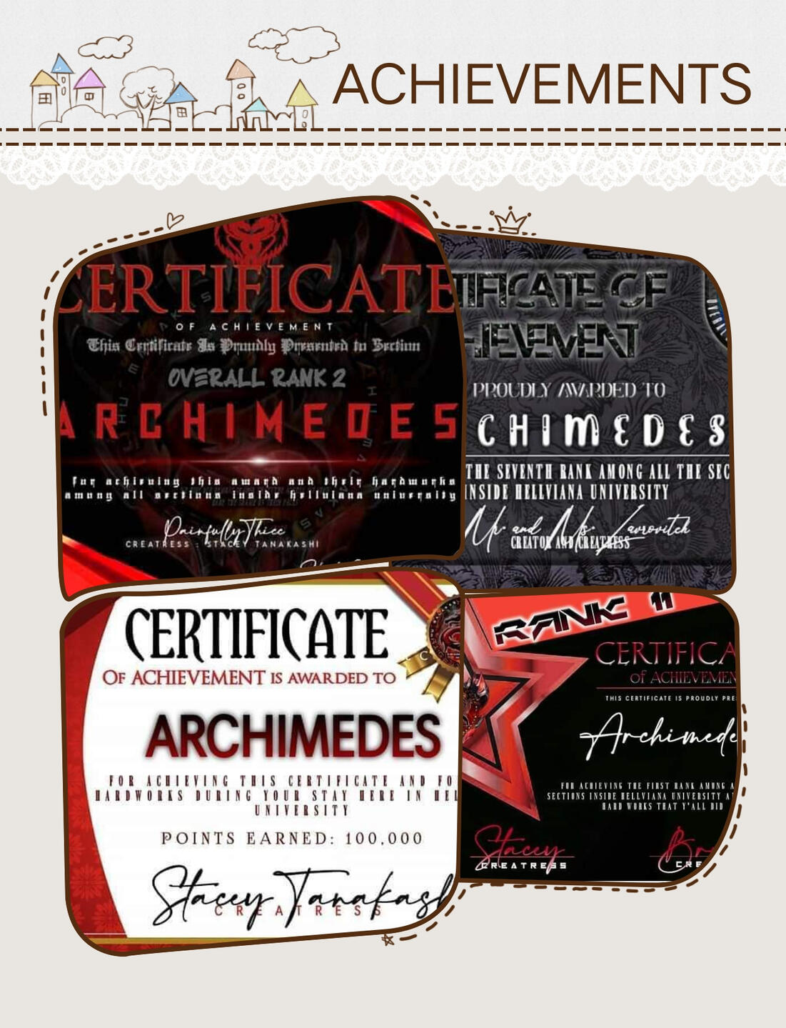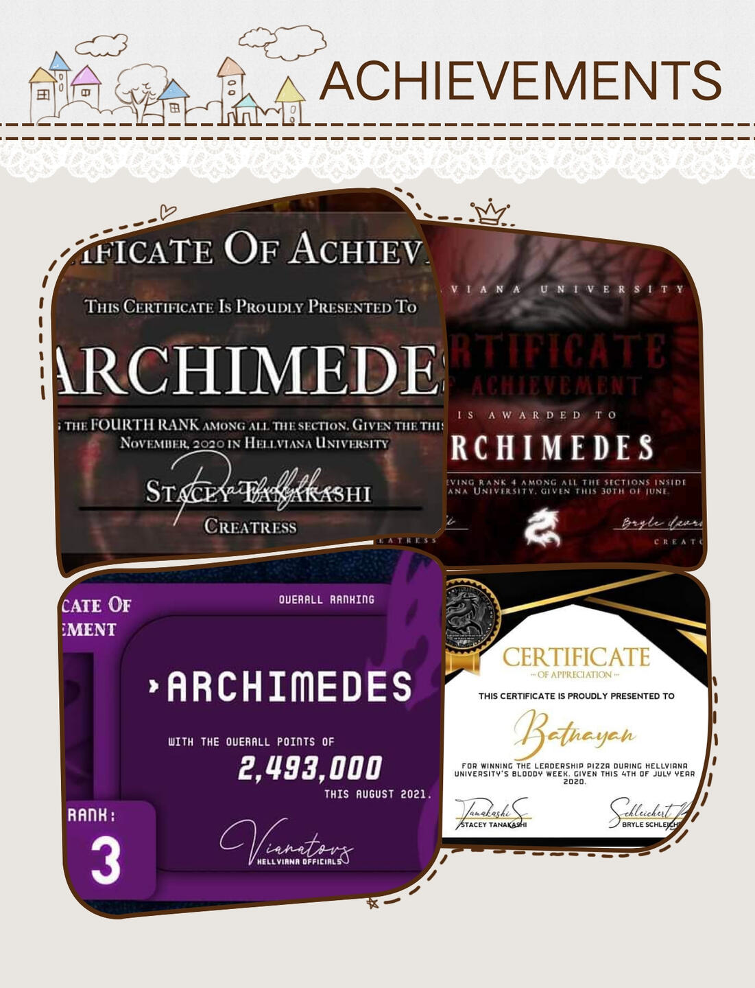 ''Archimedes changed a lot throughout the year na andito ako. 2020 is the time na kilala ang archi as troublemakers kasi araw araw kami binabantayan ng mga admins dahil lagi nalang may gulong nangyayari like lagi nalang silang pinapatawag sa main para umayos ng gulo then archimedes wasn't that active before kasi kasagsagan ng simula sa online classes kaya puro officers ang sumasalo ng trabaho but gladly a few months after nabago yun lahat kasi dumami ang students and we are known as a section na malakas bumangon after being inactive. Maayos naman ang mga naging officers kasi dumadaan lahat sa observation but yung iba nagbago attitude causing them na umalis/mapa alis sa archi. Archi is also known as section na puro malilibog kasi halos lahat ng students open minded and puro kalokohan lagi ang topic sa main.''